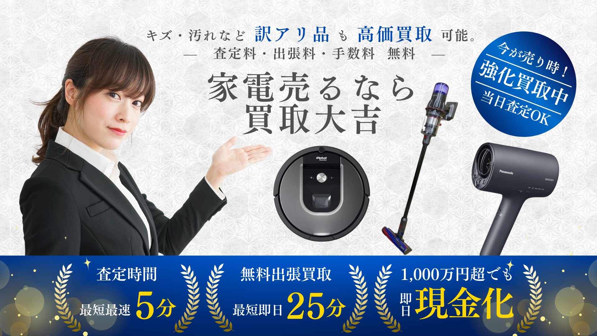ご自宅で使わなくなった家電はございませんか?炊飯器・掃除機・トースター・空気清浄機・ドライヤー・電気ケトル・ミキサーなど、小型家電を中心に幅広くお買取りいたします。箱や説明書・付属品が揃っていないお品、キズやヨゴレ、破損があるお品でも、状態を拝見のうえ査定可能な場合が多くございます。まずは無料査定をご利用ください。