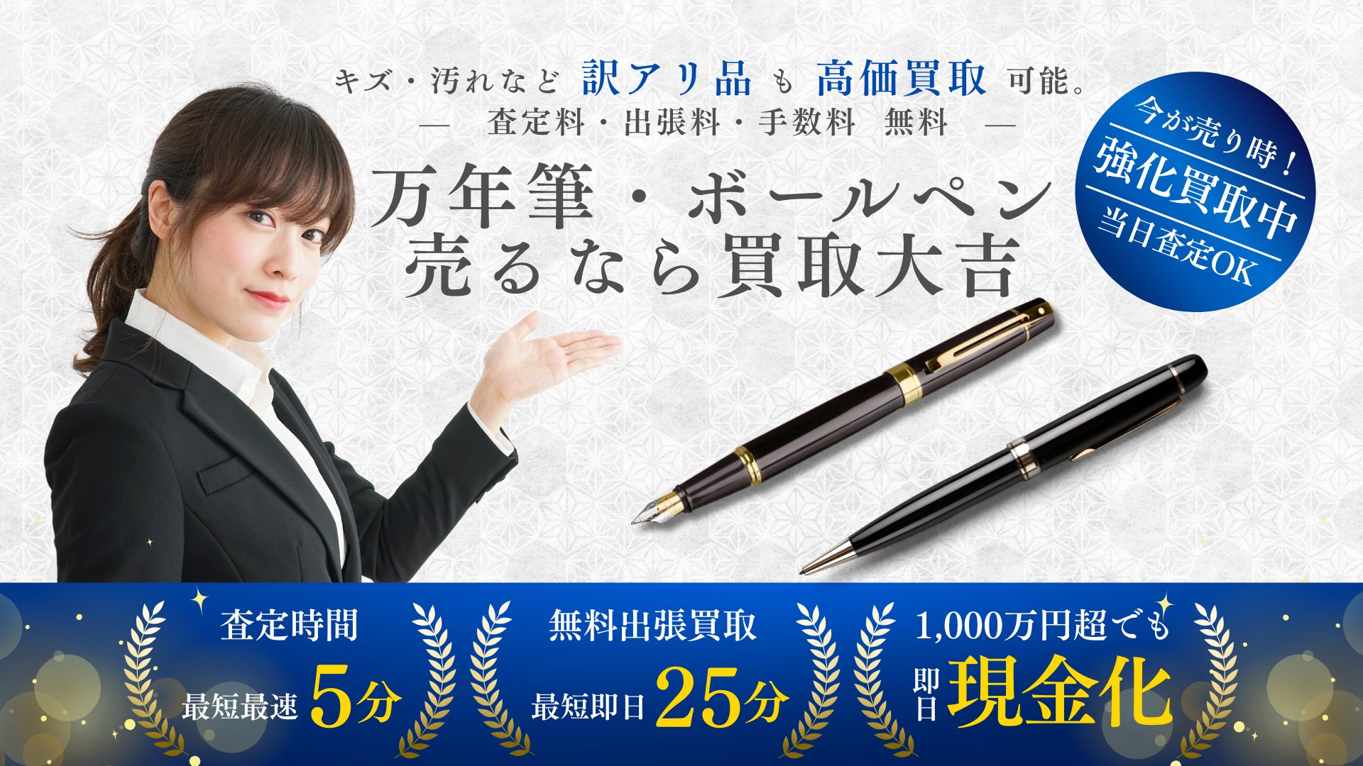 ご自宅に眠っている万年筆・ボールペンはございませんか?モンブラン、パーカー、パイロット、セーラー、プラチナ万年筆など国内外の主要ブランドまで幅広くお買取りします。査定料は無料。店頭・宅配・出張から、お客様のご都合に合わせてお選びいただけます。1点から複数点のまとめ査定まで柔軟に対応いたします。インク切れやペン先の不具合があるお品でも、状態を拝見のうえ査定可能な場合がございます。まずはお気軽に「買取大吉」へご相談ください。