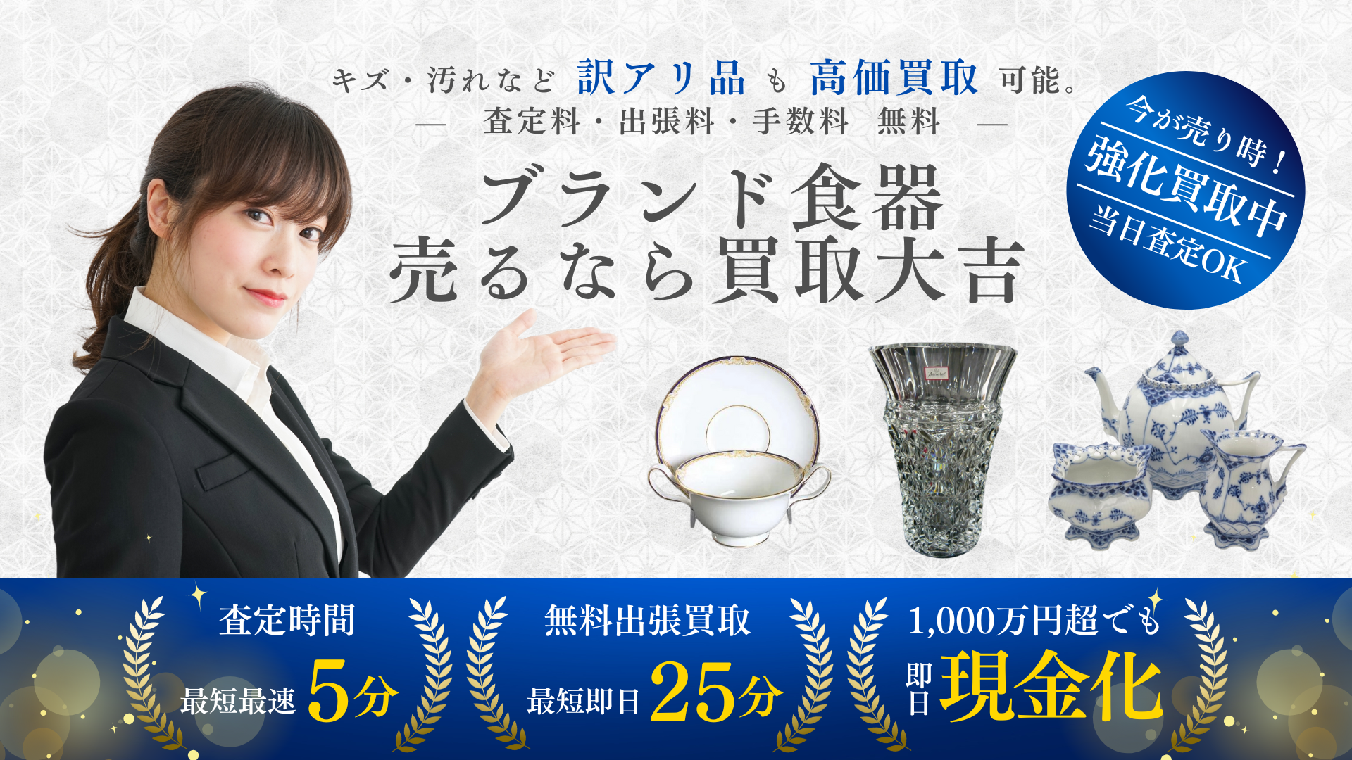 ご自宅に眠っているブランド食器はございませんか?ウェッジウッド、ロイヤルコペンハーゲン、マイセンなど、国内外の人気ブランドを幅広くお買取りします。査定料は無料。店頭・宅配・出張の3つからご都合に合わせてお選びいただけます。未使用品はもちろん、箱なしやわずかなキズ・ヨゴレがあるお品でも拝見可能です。まずはお気軽に「買取大吉」へご相談ください。